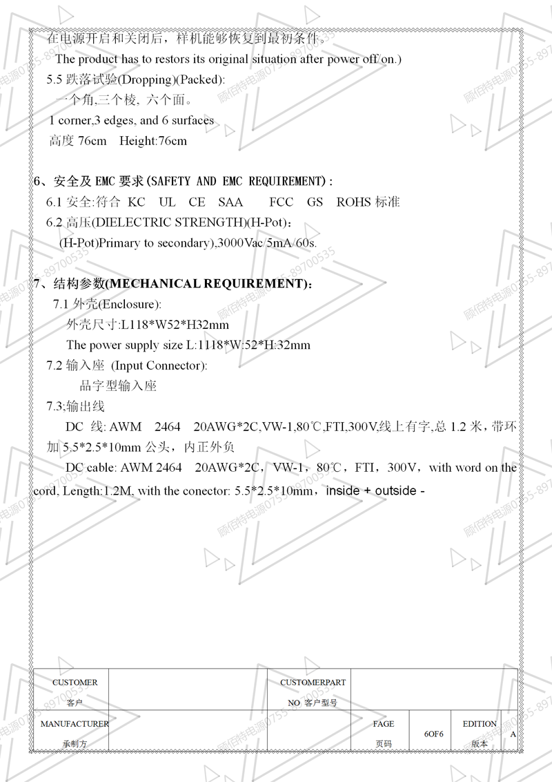 19V3.5A電源適配器規(guī)格書